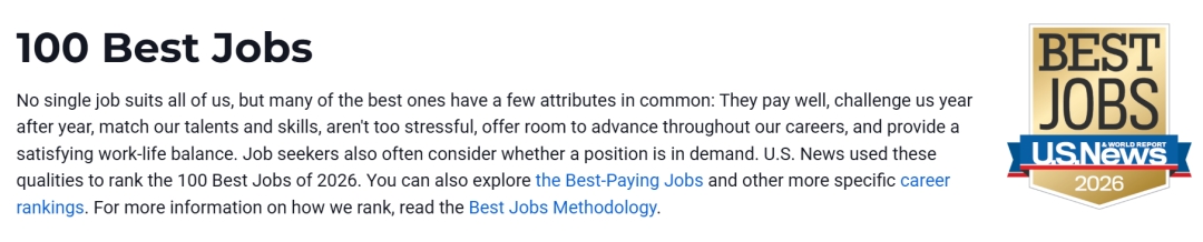 近日,U.S. News发布了2026年100个最佳职业榜单,或能为正在选择留学方向的同学们提供有价值的参考。